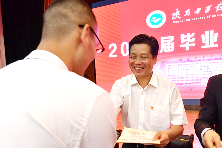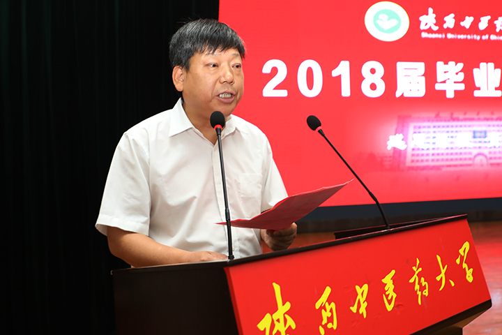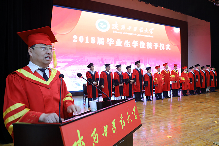 7月3日上午,我校2018届毕业生毕业典礼暨学位授予仪式在会展中心隆重举行。三千多名陕中医学子挥别母校,开启人生新征程。全体校领导及国医大师张学文教授,各院(系部)党政负责人,职能处室负责人,各院(系)秘书、辅导员、班主任,教师代表,毕业生代表及家长代表共1000余人参加了毕业典礼。我校杰出校友、中国中医科学院博士生导师韩学杰研究员应邀出席仪式并发言。毕业典礼由校党委副书记于远望教授主持,学位授予仪式由校学位委员会副主席、副校长王瑞辉教授主持。