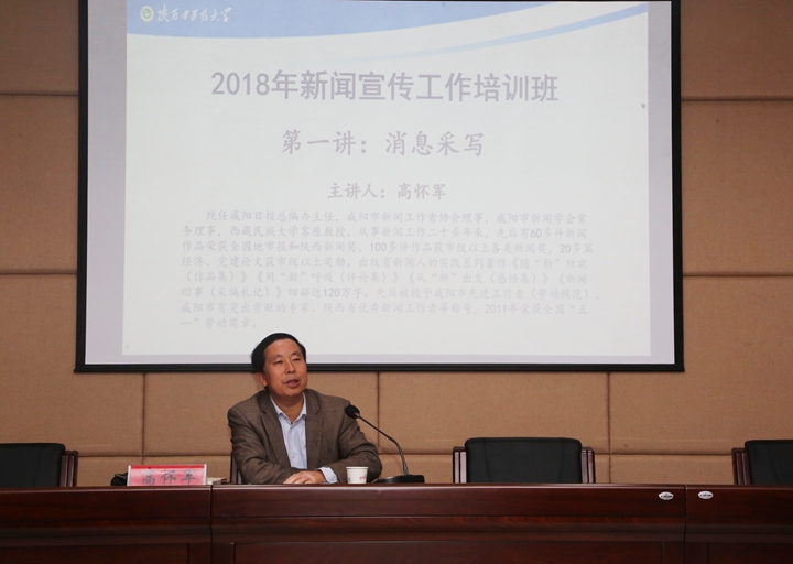 咸阳日报总编办主任、高级记者高怀军以《消息采写》为题进行首场培训,从校园通讯员如何捕捉新闻线索入手,系统讲解了消息写作的基本知识,结合全国及全省高校校园新闻案例阐述了典型报道的方法和技巧,并针对当前校园新闻采写的常见问题提出意见和建议。讲座内容丰富,观点新颖,案例经典,翔实精彩,赢得与会人员阵阵掌声。